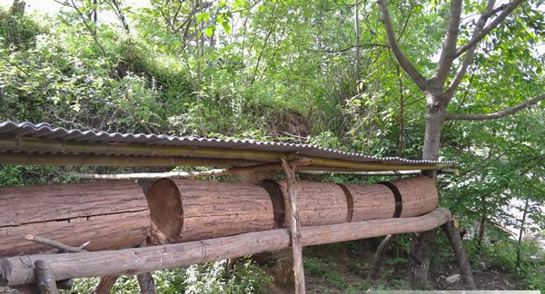 (老式的圆桶养殖,放在大山里,有时候会有野蜂跑来安家,蜂农收回去就多了一份收获啦。)